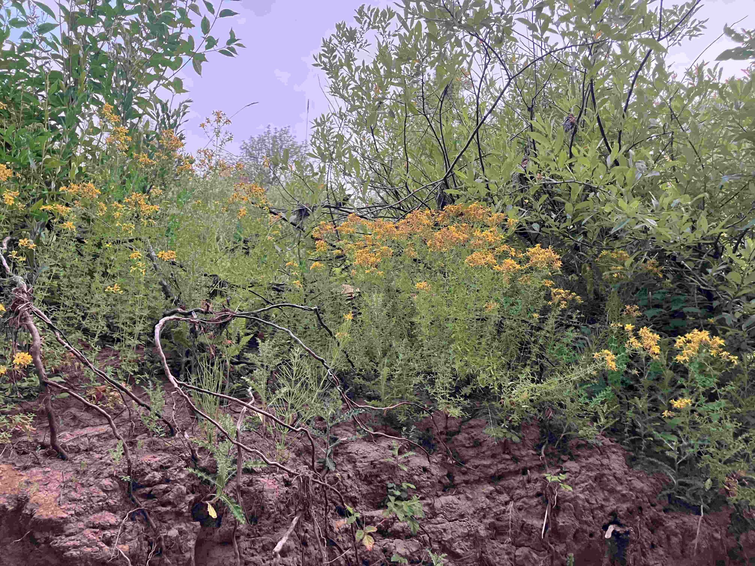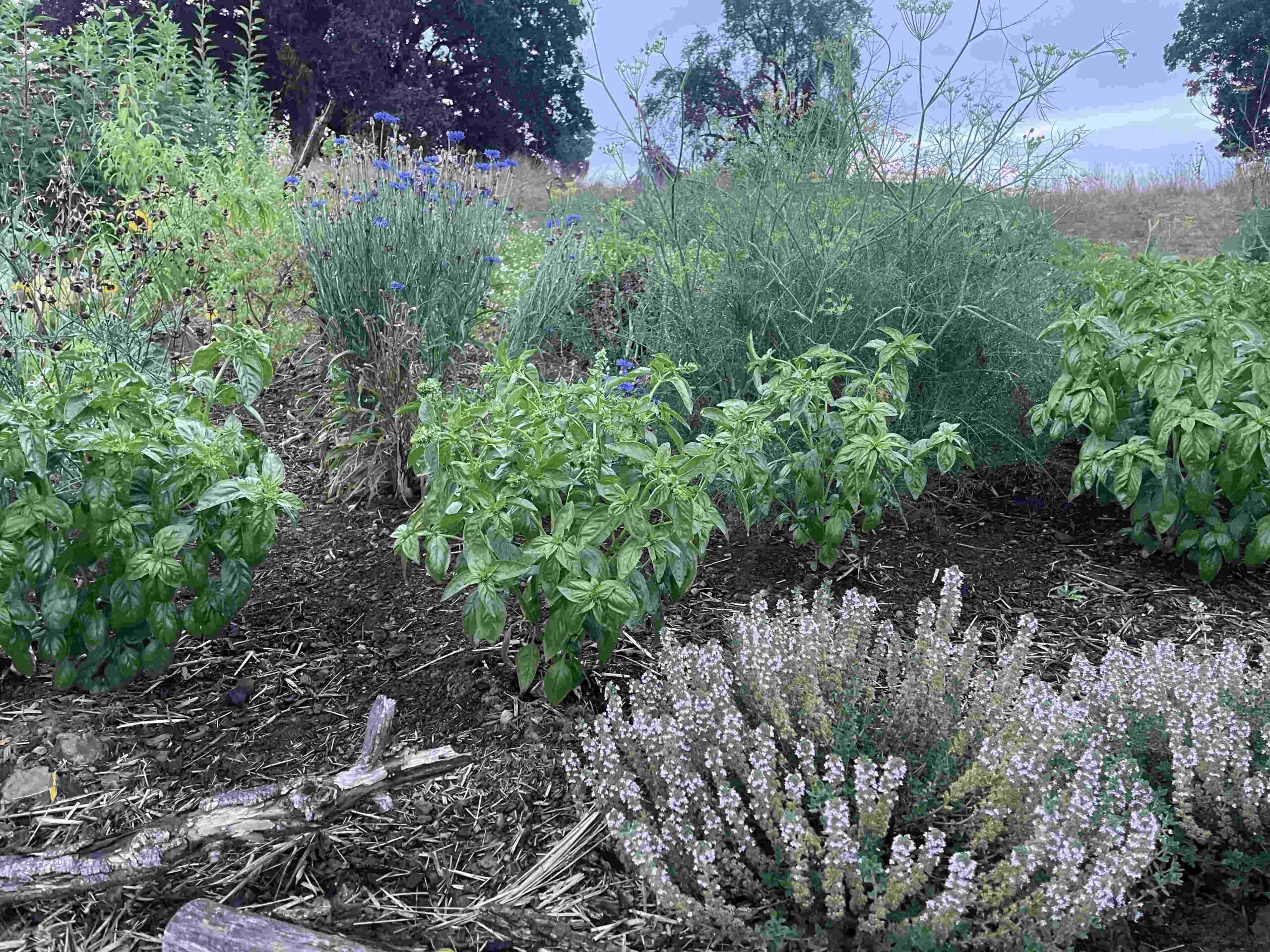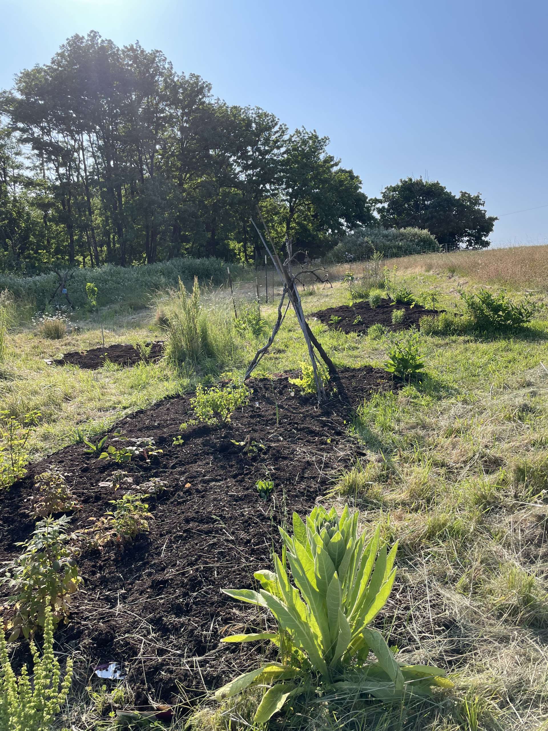 We grow medicinal herbs such as Tulsi (Ocimum africanum), Elecampane (Inula helenium), Feverfew (Tanacetum parthenium), and Echinacea (Echinacea angustifolia), alongside culinary herbs and seasonal vegetables. We are also in the second year of establishing a food forest of perennial herbs, berry bushes, and fruit trees. Our plantings are chosen to support ecological resilience, pollinator habitat, regional food needs, and sustainability.